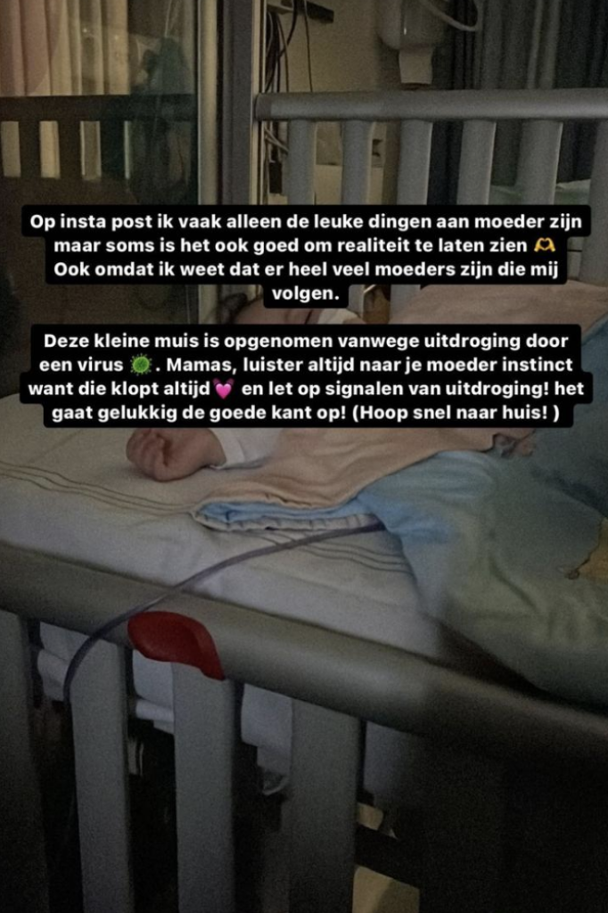 'Deze kleine muis is opgenomen vanwege uitdroging door een virus', vervolgt Demi. Dan richt ze zich tot andere moeders. 'Luister altijd naar je moederinstinct want dat klopt altijd. En let op signalen van uitdroging.'