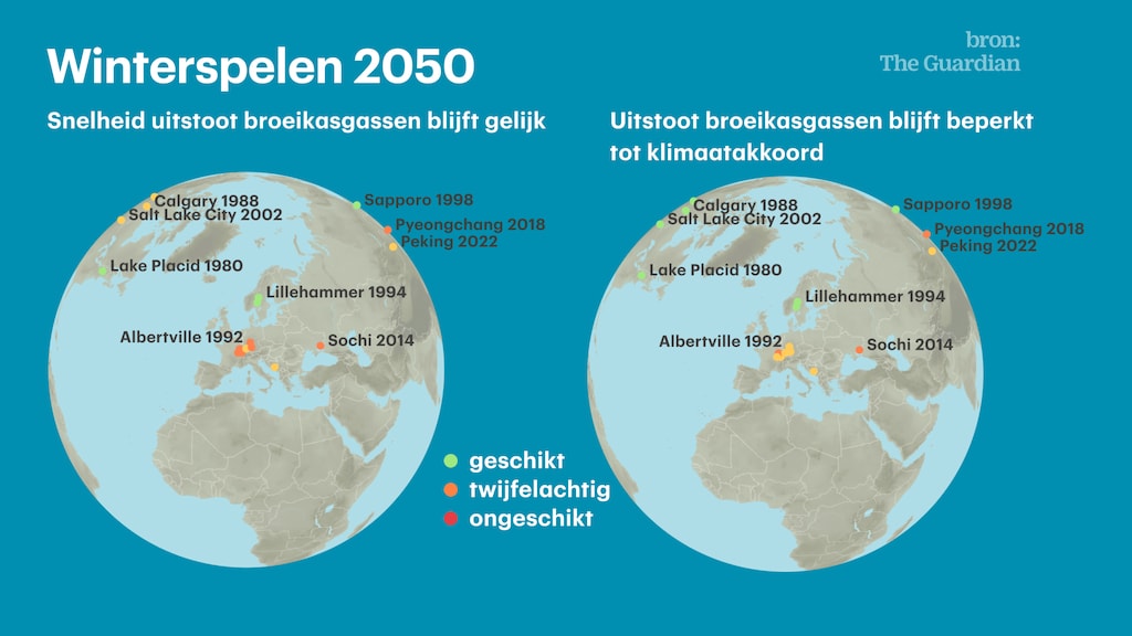 Maar dat hóeft niet. De onderzoekers deden die berekening op basis van de huidige uitstoot van broeikasgassen, zegt meteoroloog Maurice Middendorp van Buienradar. Als de maximale opwarming van 1,5 graden uit het Parijsakkoord nog wordt gehaald, stijgt het aantal steden waar de Spelen gehouden kunnen worden plots tot 9. In onderstaande wereldbollen zie je de verschillen: