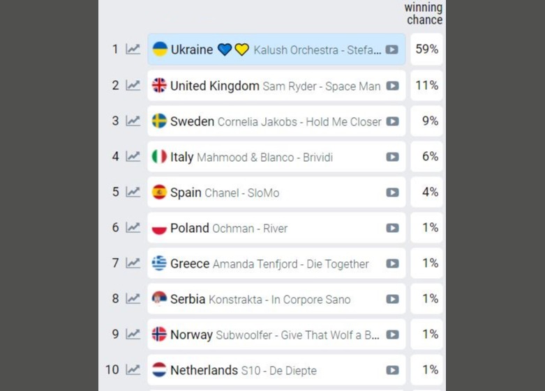 De oorlog in Oekraïne woekert voort en de beelden van verwoestingen, uiteengescheurde families en neergeschoten burgers gaan door heel Europa. Niet zo gek dus dat veel Europeanen veel sympathie hebben voor het Oost-Europese land. En dat is ook terug te zien bij de bookmakers. Oekraïne torent, met Kalush Orchestra en hun song 'Stefania', namelijk al wekenlang boven de rest uit. Op dit moment is de kans dat het land wint 59 procent. Gevolgd door het Verenigd Koninkrijk (11 procent) en Zweden (9 procent).