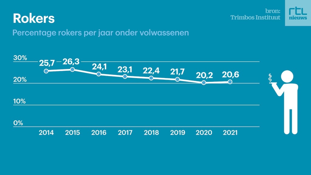 Ook is er voor het eerst sinds 2015 geen daling in het aantal volwassenen dat rookt. Zo rookte in 2015 bijna 26 procent van de volwassenen, maar blijft het aantal sinds 2020 hangen rond 20 procent. In totaal rookten er in 2021 2,9 miljoen mensen.