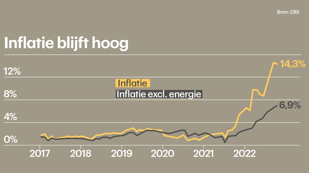 Voor goederen en diensten betaalde je in oktober 14,3 procent meer dan een jaar eerder. Daarmee is de inflatie wel iets minder hoog dan in september, maar het slechte nieuws is dat zonder energieprijzen mee te rekenen, de inflatie juist oploopt.