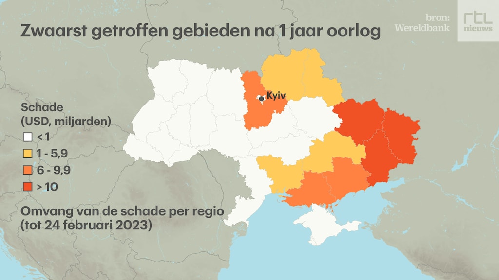 De directe schade die door raketinslagen en beschietingen is ontstaan aan gebouwen en infrastructuur is enorm en bedraagt ruim 125 miljard euro. Daarbij is de schade in de door Rusland bezette gebieden nog niet eens meegerekend. Het bbp van Oekraine, oftewel de waarde van alle in het land geproduceerde goederen en diensten, kromp in 2022 met maar liefst 29,2 procent.