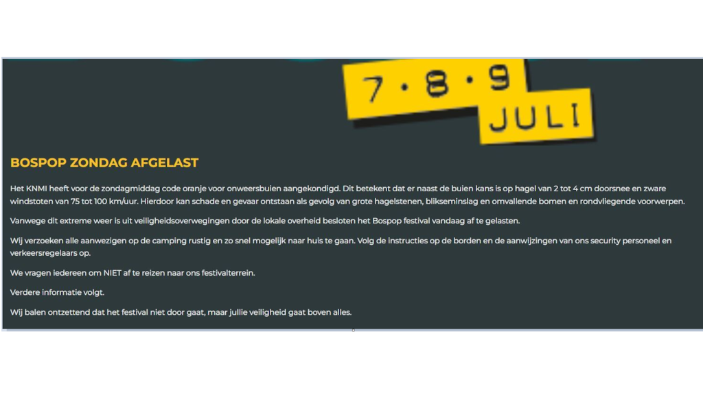 Voor Bospop in Weert betekent de weersverwachting eveneens dat de laatste dag van het festival is geschrapt.