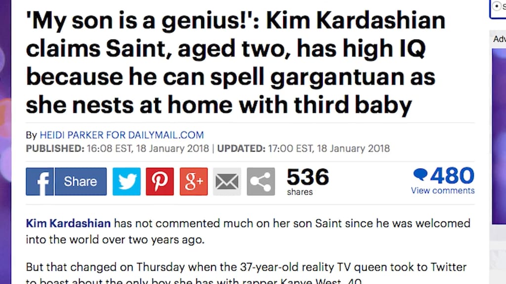 We beginnen met een opvallende uitspraak van Kim over haar kinderen. De selfiequeen schept op over haar zoontje Saint. Hij zou een genie zijn, omdat het eerste woord wat hij ooit spelde het moeilijke woord 'gargantuan' is.