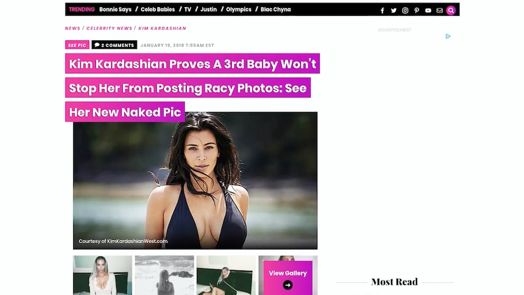 Dan komt er nieuws over Kim zelf. 'Kim Kardashian bewijst dat een derde kindje haar niet weerhoudt van het plaatsen van naaktfoto's'.
