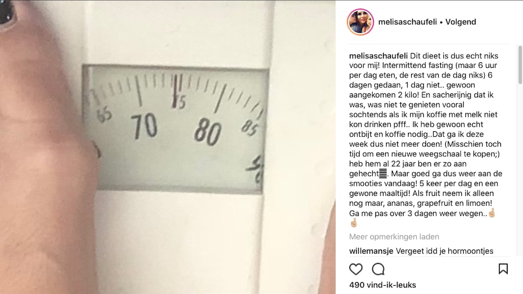 De kilo's vliegen eraf, maar toch heeft Melisa besloten het over een andere boeg te gooien. Helaas zonder succes: “Dit dieet is dus echt niks voor mij!” schrijft de realityster onder een kiekje van haar afvalrace. “Gewoon aangekomen, twee kilo.”