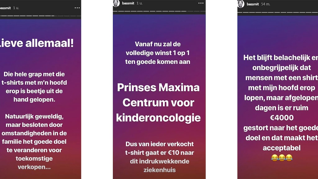 Vanaf nu gaat van ieder verkocht t-shirt 10 euro naar het "indrukwekkende ziekenhuis". Wel blijft Bas het bizar vinden dat mensen in zijn shirt rondlopen. "Het blijft belachelijk en onbegrijpelijk dat mensen met een shirt met mijn hoofd erop lopen", grapt hij in zijn Stories.
