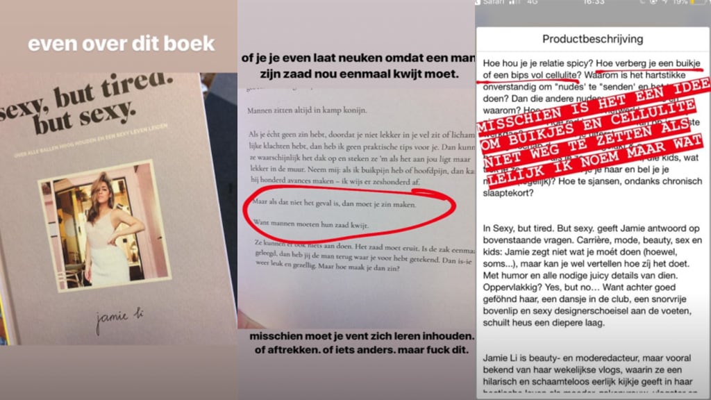 Vooral het gedeelte waarin de vlogger schrijft over seks stuit op kritiek. Jamie schrijft dat wanneer je als vrouw geen zin hebt in seks, je zin moet maken. "Want mannen moeten hun zaad kwijt," aldus de schrijfster. De passage zorgt voor veel kritische reacties op social media. Ook Tim Hofman valt over haar uitspraak en geeft haar op Instagram de volle laag: "Misschien moet je vent zich leren inhouden of aftrekken. Of iets anders. Maar fuck dit."