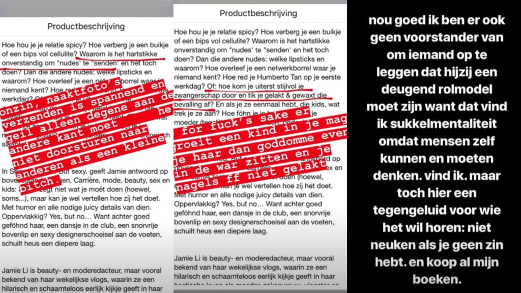 Tim Hofman, zelf ook schrijver, haalt ook de uitspraken van Jamie Li over beauty aan. Jamie schrijft bijvoorbeeld in haar boek: "Hoe verberg je een buikje of een bips vol cellulite?" Tim heeft daar een andere mening over: “Misschien is het een idee om buikjes en cellulite niet weg te zetten als lelijk ik noem maar wat.” Maar er is meer waar de presentator zich aan stoort, bijvoorbeeld het feit dat Jamie benoemt dat het hartstikke onverstandig is om naaktfoto’s te sturen. “Onzin”, noemt hij het. “Naaktfoto’s verzenden is spannend en geil. Alleen degene aan de andere kant moet het niet doorsturen naar anderen als een kleine bitch.”