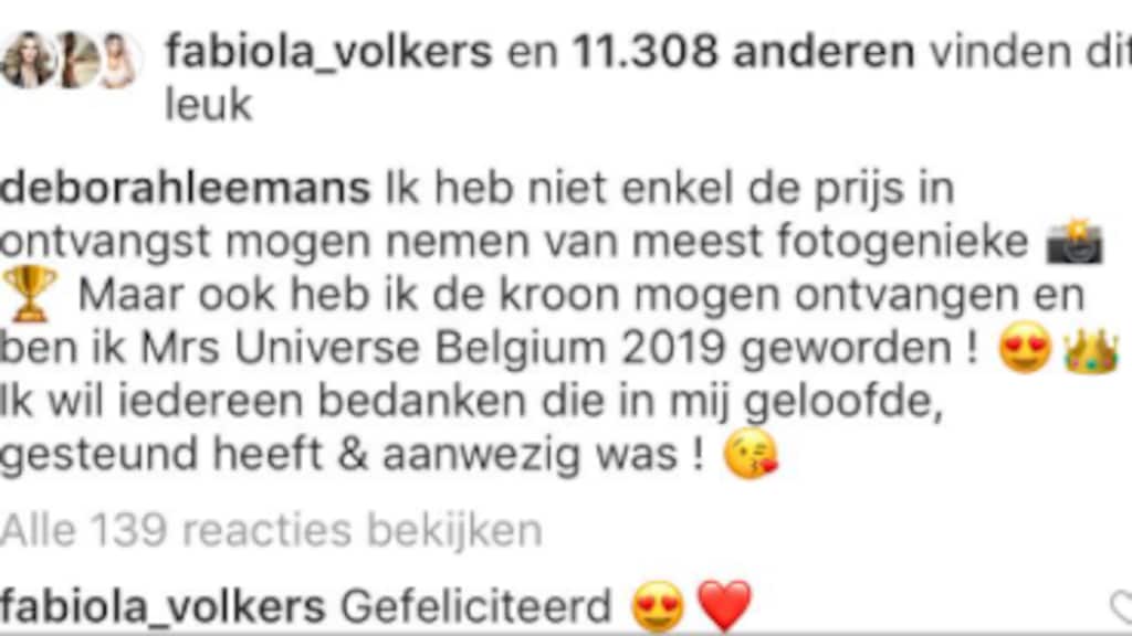 De 26-jarige dame deelt het blijde nieuws zelf op haar Instagram. “Ik heb niet enkel de prijs in ontvangst mogen nemen van meest fotogenieke deelneemster, maar ook heb ik de kroon mogen ontvangen en ben ik Mrs Universe Belgium 2019 geworden!”, schrijft ze totaal overdonderd bij een kiekje van de wedstrijd.