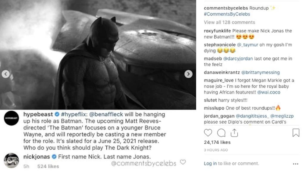 "Voornaam Nick. Achternaam Jonas", schrijft hij in een reactie op een Instagrampost van Hypebeast, waarop met een foto van Ben Affleck als Batman het nieuws werd bekendgemaakt.