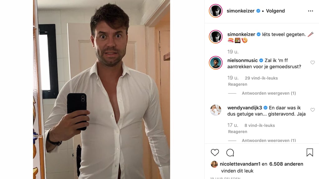 Simon Keizer (35) heeft overduidelijk genoten van de vakantie. Op Instagram deelt de zanger een kiekje waarop glashelder te zien is dat zijn shirt aan de krappe kant is. Gelukkig kan hij er zelf wel om lachen, net als zijn volgers.