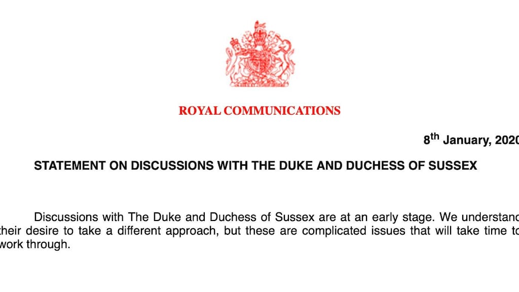 Het koningshuis zou teleurgesteld zijn over het nieuws. "We begrijpen hun verlangen voor een andere invulling, maar dit zijn ingewikkelde kwesties die tijd kosten om aan te werken", las de reactie die door Buckingham Palace naar buiten werd gebracht. Opvallend is dat de reactie vanuit de Queen is verstuurd en dus niet in samenspraak met Harry en Meghan. Dit doet de geruchten dat de rest van de Britse familie van niets wist, alleen maar meer oplaaien. Voor de Britse royal family kwam de beslissing volgens Britse royaltyverslaggevers als een verrassing.