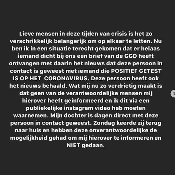 "In deze tijden van crisis is het enorm belangrijk om op elkaar te letten", begint de sneer aan het adres van Anna - die overigens nergens bij naam wordt genoemd. "Wat mij nu zo verdrietig maakt, is dat geen van de verantwoordelijke mensen mij hierover heeft geïnformeerd en ik dit via een Instagram-video heb moeten vernemen."