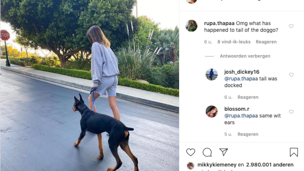 'Ze heeft het niet zelf afgeknipt', legt één volger uit naar aanleiding van de vele reacties over de hond. Zowel voor de oren als voor de staart worden gezondheidsredenen verzonnen om ze in te korten. De staart is van nature te dun, waardoor 'ie sneller breekt. Bovendien zouden Dobermanns sneller een oorinfectie krijgen als de oren niet worden gecoupeerd. Maar dat gaat er niet in bij de critici. 'Het is voor de look en dat is de enige reden.' Deze procedures zijn ook illegaal in Nederland en vele andere landen, tenzij er een daadwerkelijke medische reden voor is zoals een tumor in het oor of in de staart.