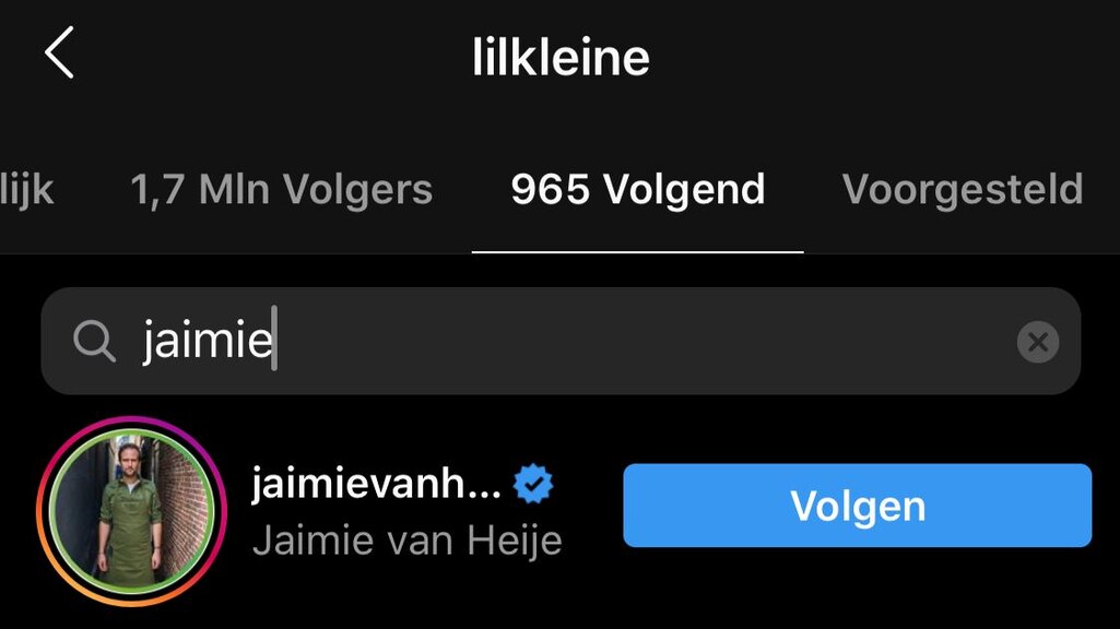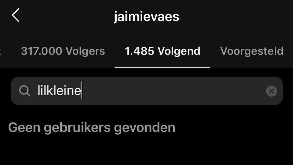 Maar wat de geruchten over een mogelijke breuk vooral aanwakkert, is het feit dat Jorik, zoals Lil' Kleine eigenlijk heet, en Jaimie elkaar niet meer volgen op Instagram. Als je op beide profielen zoekt of ze elkaar volgen, is het resultaat negatief, zoals te zien is op onderstaande foto's.