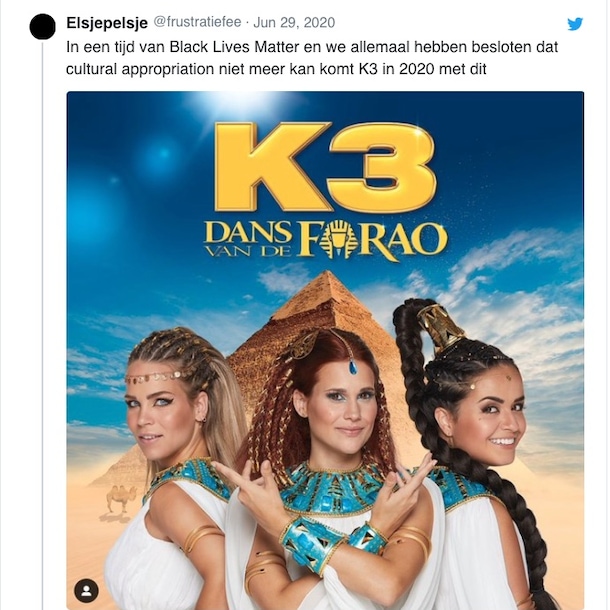Dans van de Farao zou de volgende K3-filmhit moeten worden, maar Studio 100 zal zich nu wel eventjes achter de oren krabben. Hanne, Marthe en Klaasje dragen namelijk traditionele Egyptische kostuums, compleet met opgemaakte ogen en gevlochten haren die daarbij passen. 'In een tijd van Black Lives Matter en we allemaal hebben besloten dat cultural appropriation niet meer kan, komt K3 in 2020 met dít?' vraagt één twitteraar zich hardop af.