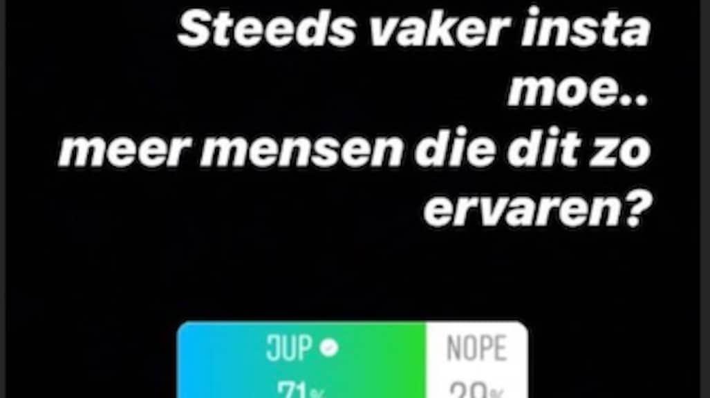 Ook is Tim het wel een beetje zat op social media. Hij geeft aan 'Insta-moe' te zijn en vraagt zijn volgers of ze die mening delen. Een ruime meerderheid van 71% heeft hetzelfde gevoel als de zanger en dat komt voor hem als een verrassing. 'Wow! Meer met mij dus!' reageert hij op de uitslag van de poll. 'Bewustwording.'