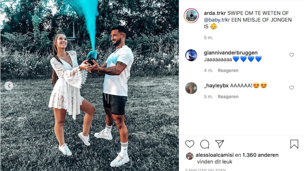 Het kwam als een grote shock voor de fans van Temptation Island dat Arda en Amber niet alleen bij elkaar zijn, maar zelfs samenwonen en een baby verwachten. De tijd begint te dringen, want de kleine komt er al bíjna aan. En om hun volgers niet langer in spanning te houden, hebben de twee besloten om hun gender reveal op Instagram te delen. 'Swipe om te zien of Baby Türkèr een jongen of meisje is', schrijft Arda erbij.
