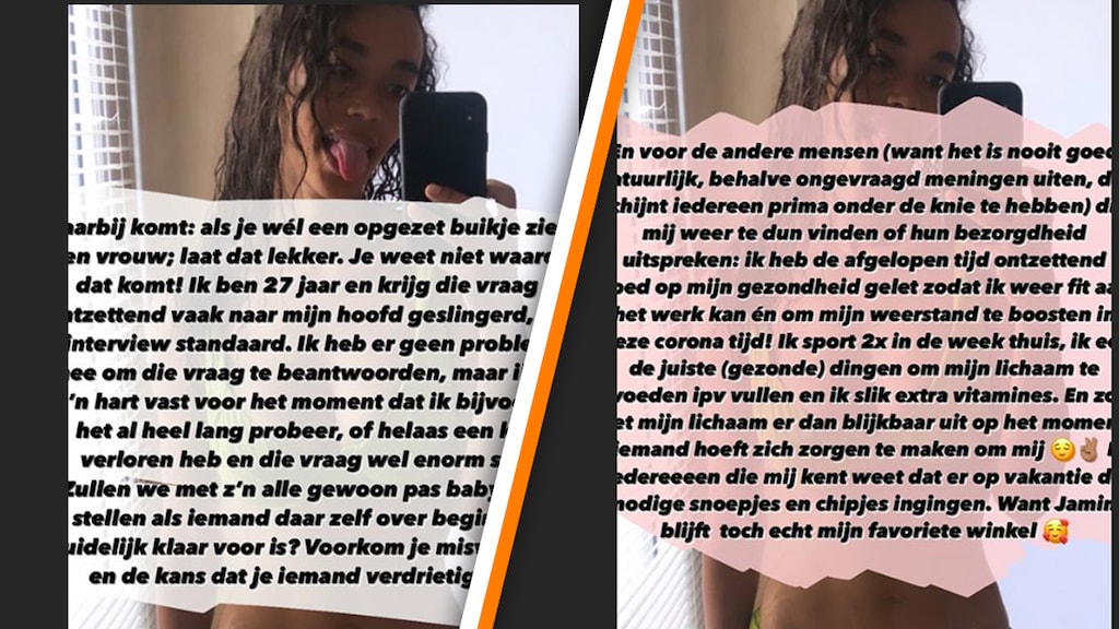 Het is volgens Romy niet nodig om te speculeren, want ze wil nog geen kindje. 'Dus als je het woord 'baby' ziet of een opgezet (food)buikje of zelfs een hand op mijn: er zit geen baby in', vertelt ze stellig. Het is niet de eerste keer dat Romy zo openhartig reageert op de vragen rondom haar gewicht. Tijdens de coronacrisis had ze er een paar kilo's bijgekregen. 'Zitten we nog vol in corona-quarantaine-alles-vreet-modus?' vroeg ze aan haar volgers. 'Ik was in ieder geval 8 kilo aangekomen (...) En dat is best knap.'