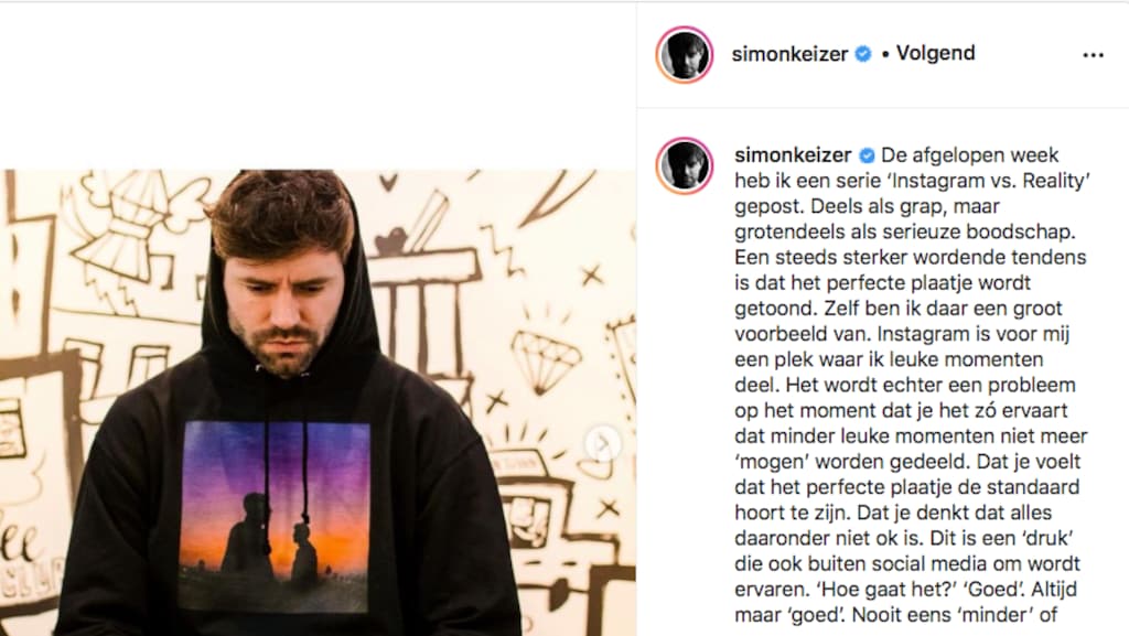 Simon Keizer (36) wil dat mensen zich kwetsbaarder opstellen op Instagram. Volgens de Volendamse zanger gebeurt dat namelijk te weinig, omdat 'het perfecte plaatje' de standaard is, schrijft hij vrijdag op het sociale medium.