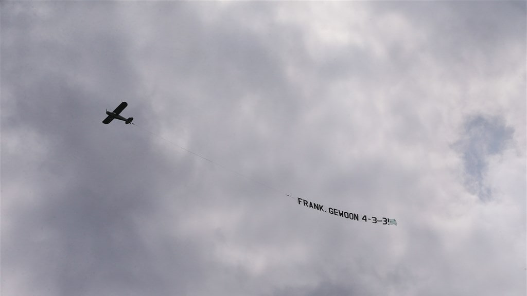 Boven het complex van de KNVB in Zeist cirkelde een vliegtuigje, die een banner achter zich aan sleepte met de tekst 'Frank, gewoon 4-3-3!'. Veel spelers van Oranje moesten hard lachen toen ze de boodschap voor bondscoach Frank de Boer zagen.