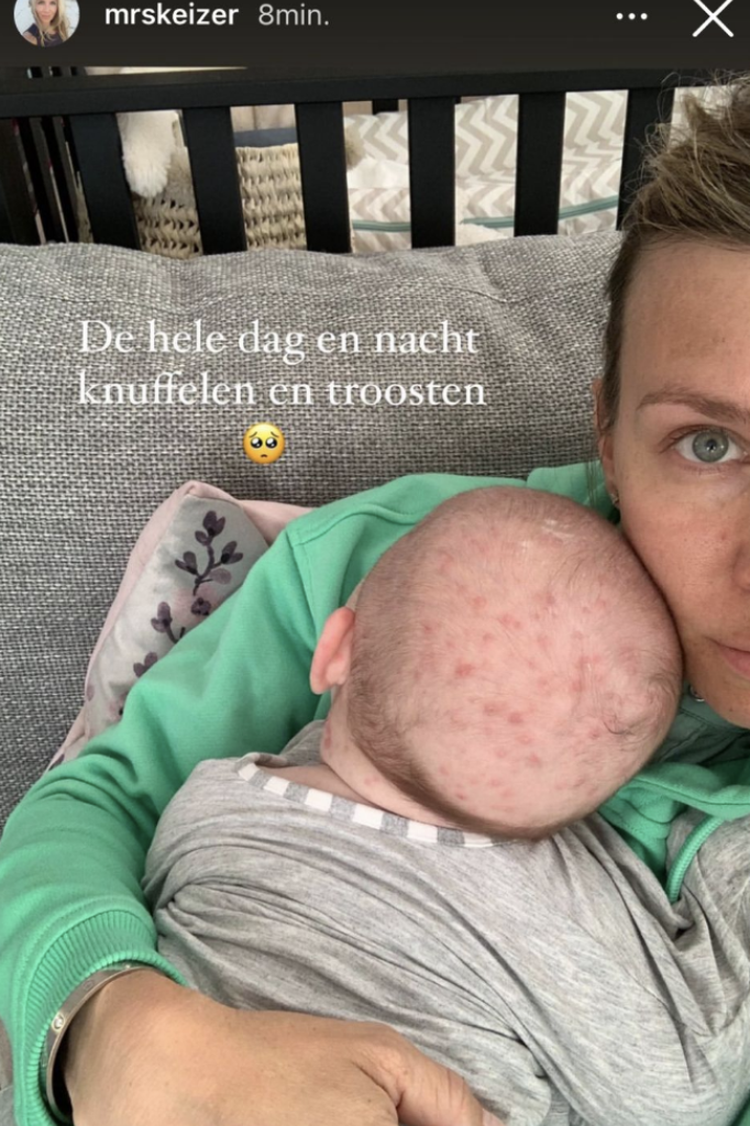 Op Instagram Stories deelt Annemarie een foto van het nog niet zo harige bolletje van haar zoontje. Op zijn hoofd is te zien dat Joa het flink te pakken heeft. 'De hele dag knuffelen en troosten', schrijft Annemarie bij de foto. Het gezichtje van Joa is niet te zien op het beeld, maar als we Annemarie moeten geloven, zit haar zoontje daar nóg meer onder de waterpokken.