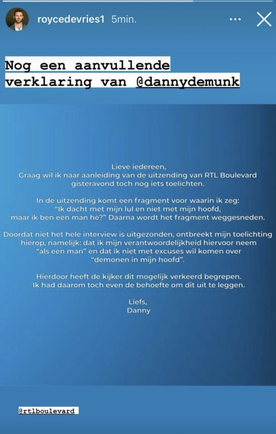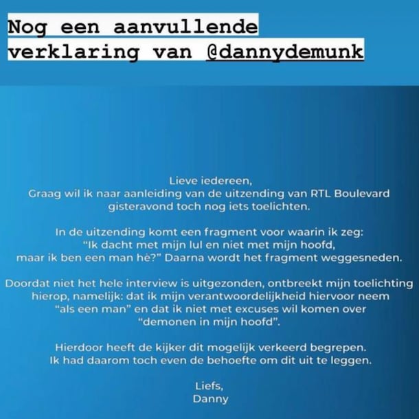 Via zijn advocaat, Royce de Vries, wil hij daar nog iets aan toevoegen. Hij laat weten: 'Doordat niet het hele interview is uitgezonden, ontbreekt mijn toelichting hierop, namelijk: dat ik mijn verantwoordelijkheid hiervoor neem 'als een man' en dat ik niet met excuses wil komen over 'demonen in mijn hoofd'. Hierdoor heeft de kijker dit mogelijk verkeerd begrepen. Ik had daarom toch even de behoefte om dit uit te leggen.''