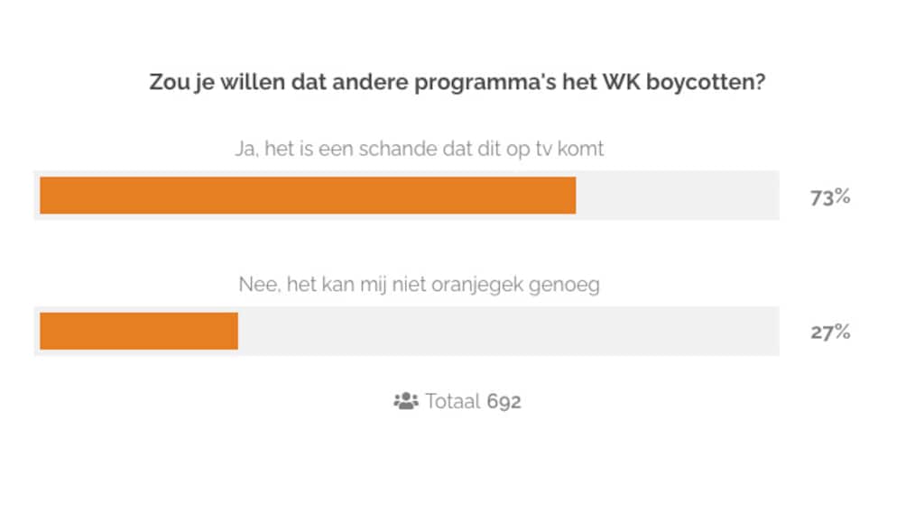 We vroegen jullie of jullie vinden dat andere programma's ook het WK in Qatar moeten boycotten. Op de poll werd 692 keer gestemd. De meesten vinden dat het een schande is dat het WK op tv komt; 73% van de stemmers is van mening dat andere programma's het voorbeeld van Jan-Willem Start Op! moeten volgen. 27% van de stemmers vindt een boycot niet nodig en is van mening dat het niet oranjegek genoeg kan.