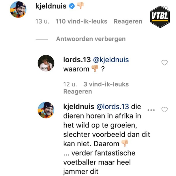 Als iemand vraag waarom Nuis zo reageert geeft de schaatser meer uitleg. ''Dieren horen in Afrika in het wild op te groeien, slechter voorbeeld dan dit kan niet. Daarom...verder fantastische voetballer, maar heel jammer dit''