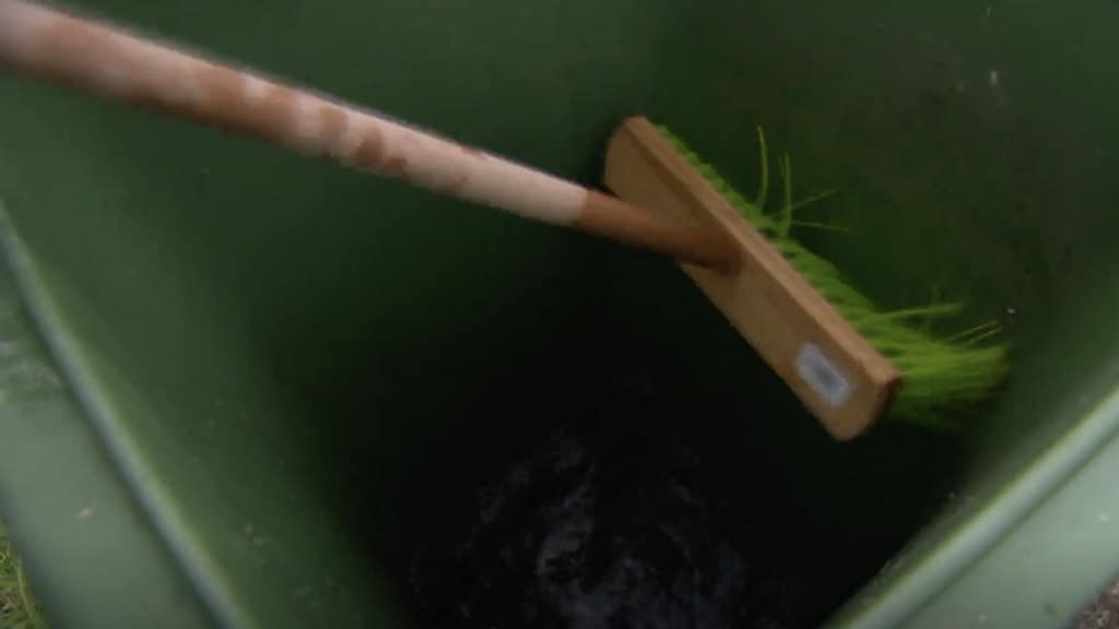 Allereerst zorg je ervoor dat de bak helemaal leeg is. Gooi daarna de volledige fles schoonmaakazijn leeg in de bak. Zamarra: "Azijn is niet schadelijk voor het milieu en het reinigt én desinfecteert. Perfect dus om te gebruiken voor dit klusje. Giet er een emmer water overheen en je kunt starten met schrobben."