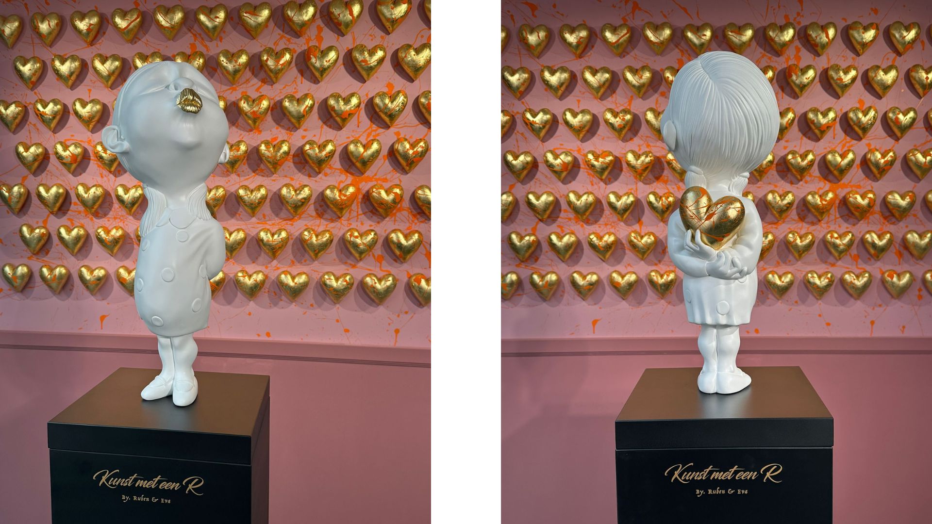 Naast de kunstwerken die naar galeries of klanten worden verzonden, houden Ruben en Eva zich ook geregeld bezig met unieke projecten met een bijzonder verhaal. Zo maakten ze onlangs voor het Prinses Máxima Gala een sculptuur van een meisje met gouden getuite lippen, met achterop haar rug een gouden hart. "Op de wand voor haar zie je 150 kleine, gouden hartjes waarvan er één was beschilderd door de ernstig zieke Jade. De opbrengst van dit kunstwerk ging naar het Prinses Máxima fonds, voor onderzoek naar kinderkanker."