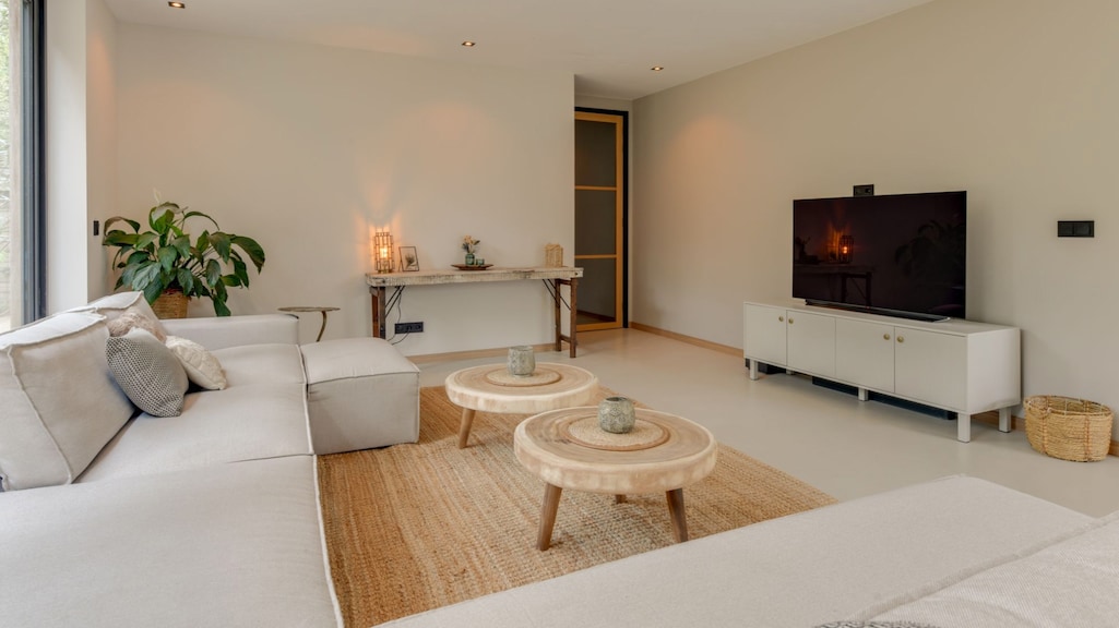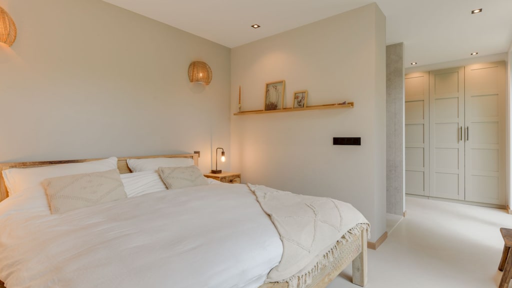 De strakke gietvloer is beige, de keuken nét een tintje donkerder, de bank juist weer iets lichter, maar allemaal binnen hetzelfde kleurenpalet. De muren, inbouwkasten, slaapkamer, badkamer en toilet: beige. De accentkleuren? Hout, met zwarte kozijnen.