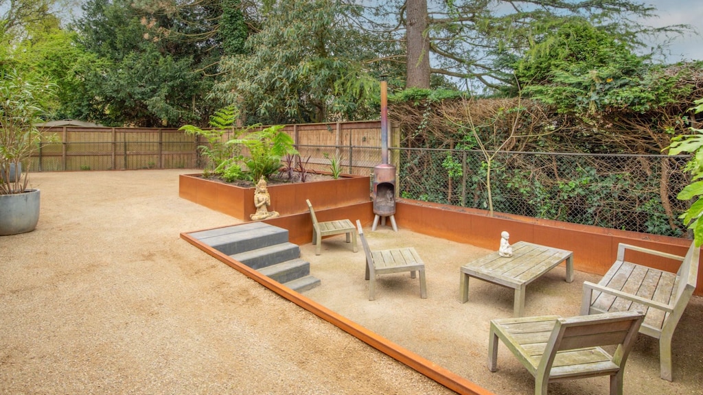 En de tuin? Je raadt het al. De onderhoudsarme buitenruimte is aangelegd met dolomietzand, een zachtgekleurde steensoort die perfect in het plaatje past.