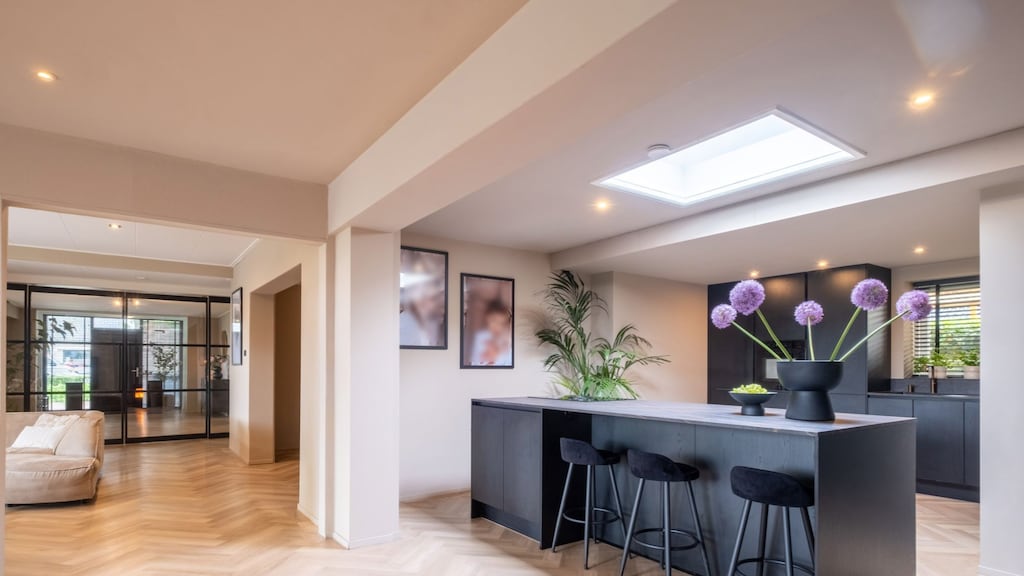 Wat dit huis echt uniek maakt? De sporen van de oude bank zijn nog goed zichtbaar. Je komt binnen via een enorme hal, waar je eerst langs een balie loopt. Loop je daarna door de stalen glazen deuren, dan stap je een ruime woonkamer binnen die overloopt in de leefkeuken (mét platdakraam) en het eetgedeelte. Aan ruimte in ieder geval geen gebrek.