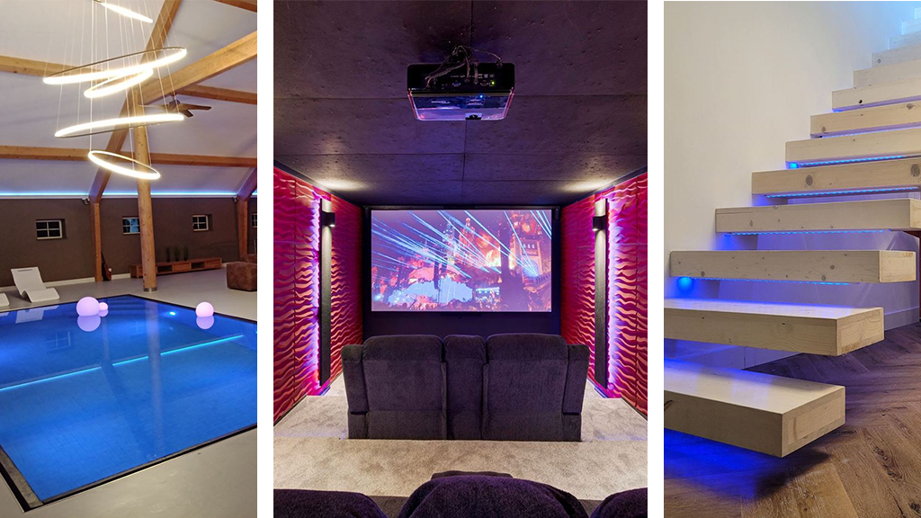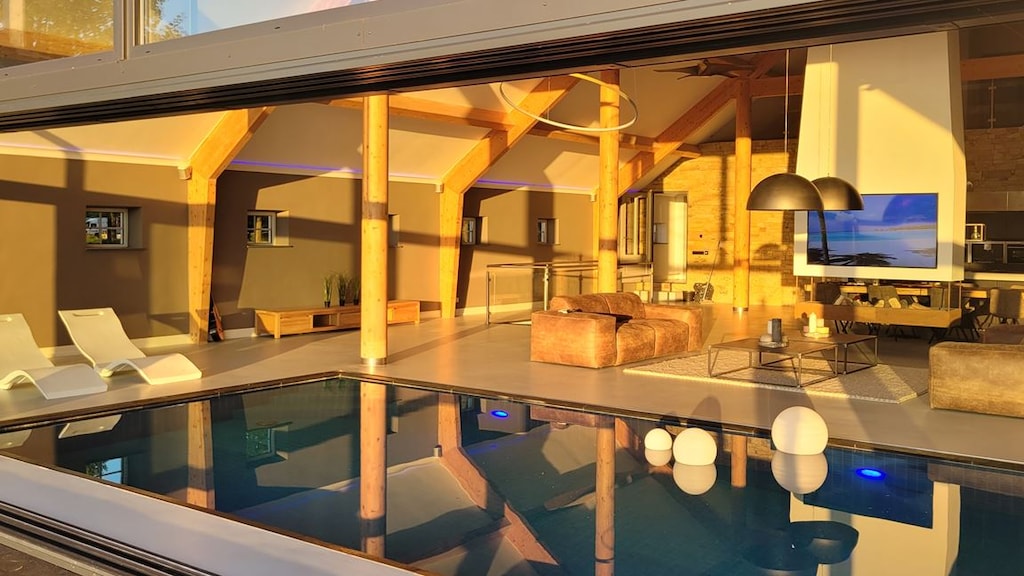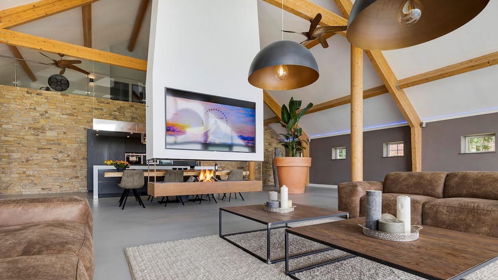 De woonboerderij aan het Noorderdiep 21 staat op bijna 2400 m² grond en heeft alles wat je maar kan wensen: een infinity pool, een zwevende open haard, een bioscoop én trappen die lijken te zweven in het niets. Alsof dat niet genoeg is, zijn de (verlichte!) plafonds ook nog eens 8 meter hoog.