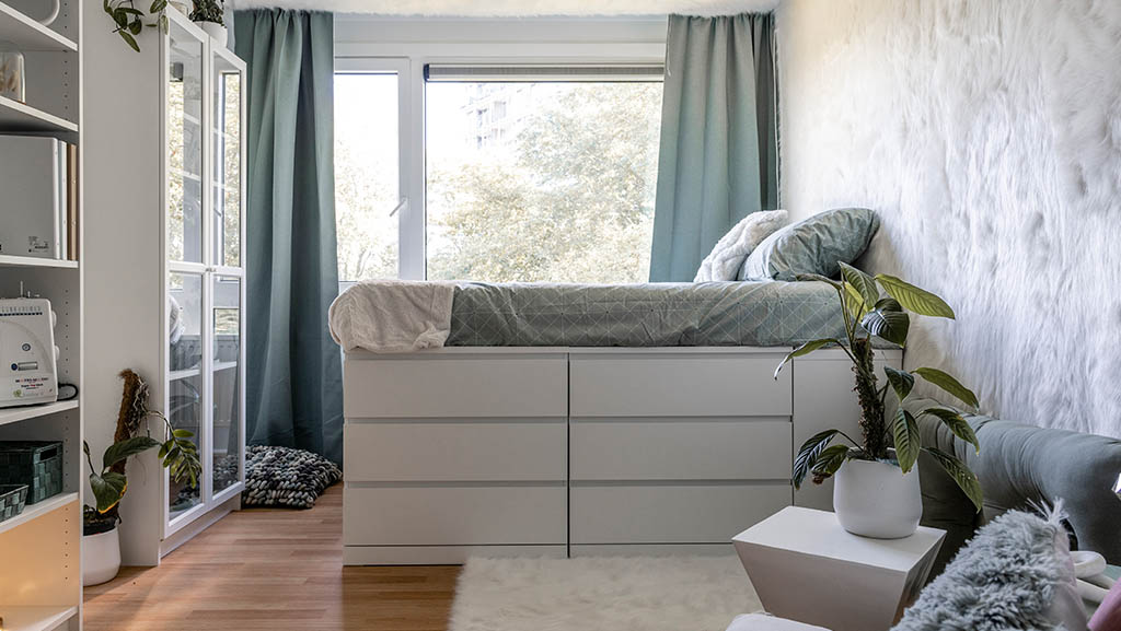 Als zangeres is een podium niet vreemd voor Ruth en de keuze was voor haar snel gemaakt om dit element door te voeren in de studentenkamer, zoals je op de foto hierboven ziet. Een multifunctioneel element, want bovenop kan worden gezeten en de onderkant biedt ruimte voor het opbergen van het bed en andere spullen. Bob vindt de ruimte heel volwassen en krijgt meteen een goed gevoel als hij de studio in loopt.