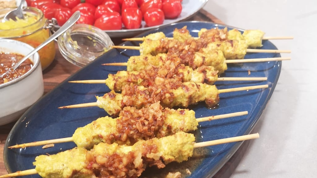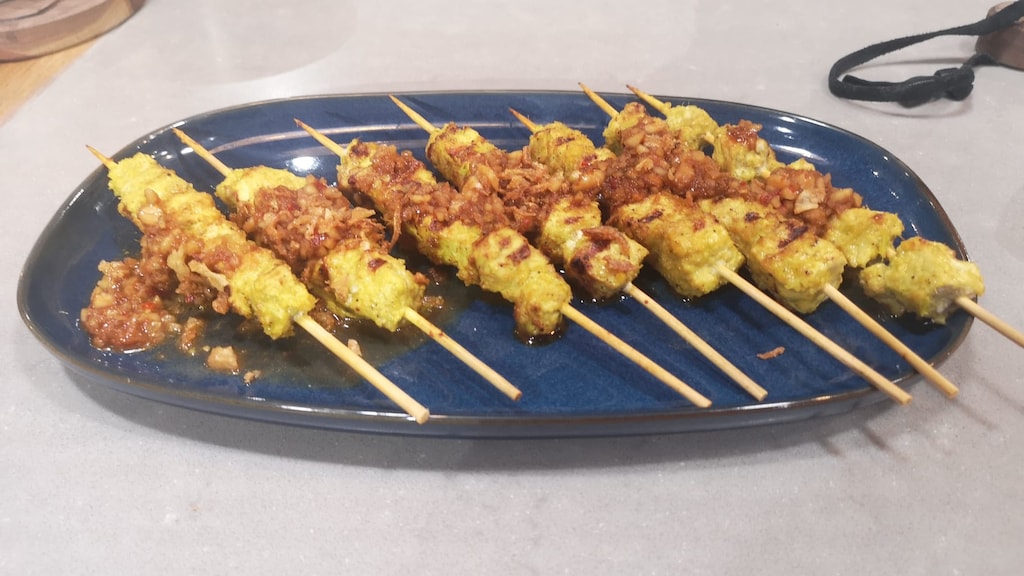 Lekkere borrelplank uit Singapore met saté en kerriepasteitjes