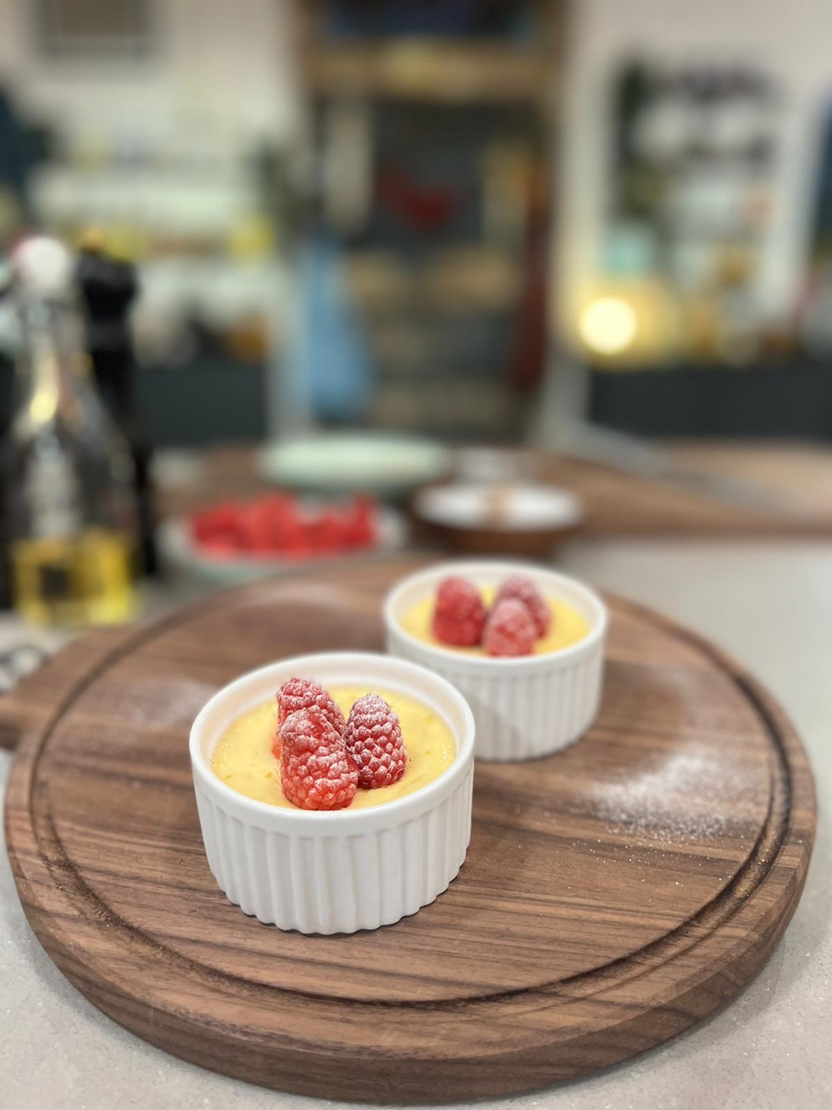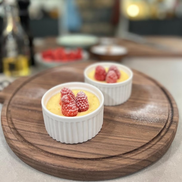 Stap 5: Schenk het custardmengsel in de ovenschaaltjes. Vul de schaal met kokend water, zodat de ovenschaaltjes half onderstaan.