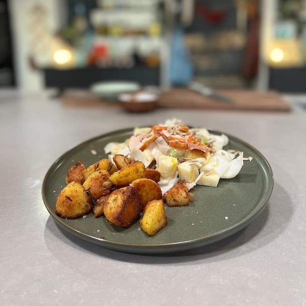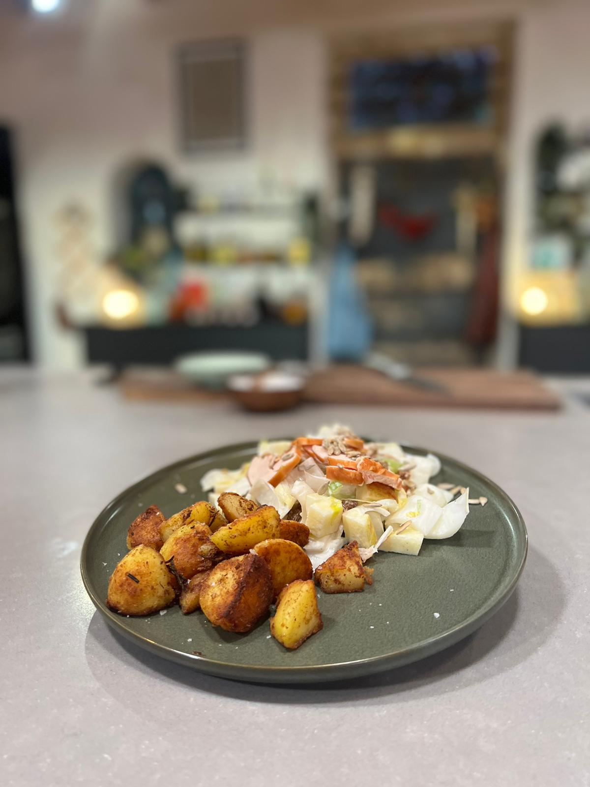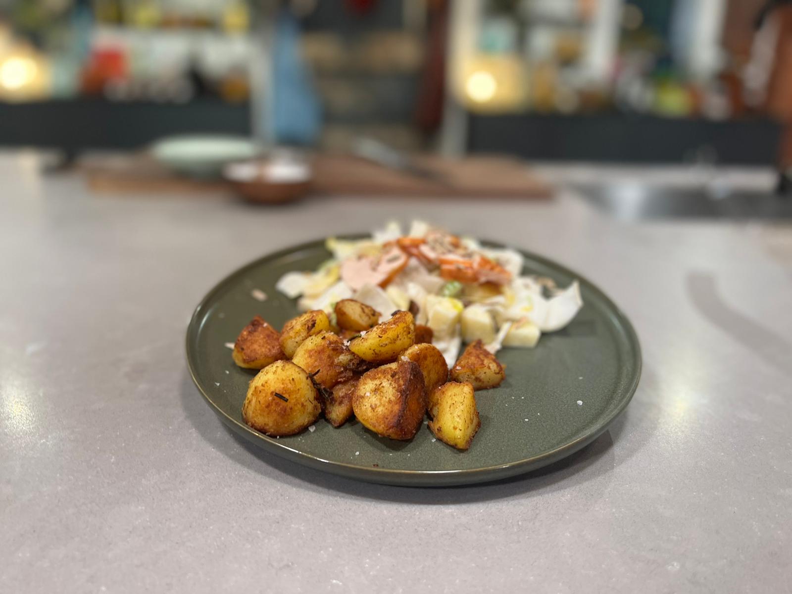 Witlofsalade met gerookte kip, gebakken aardappels én puddinkjes