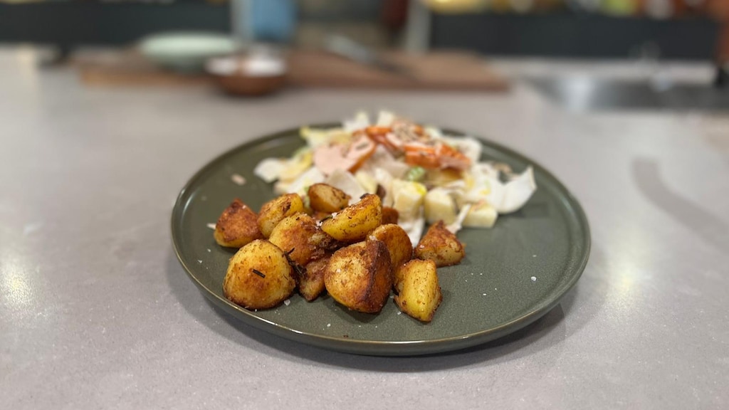 Het recept bestaat uit drie onderdelen: witlofsalade, gebakken aardappels met rozemarijn en puddinkjes uit de oven. We beginnen met de salade en verderop in het artikel vind je de benodigde ingrediënten en bereidingswijze van de aardappels en de puddinkjes.