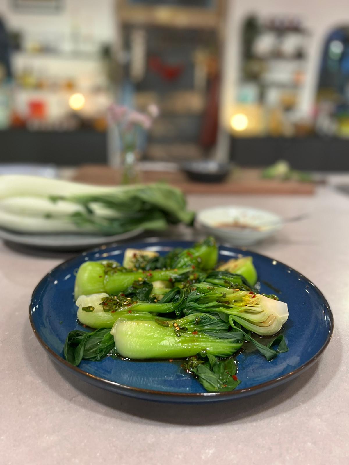 Tip: Het lekkerste is babypaksoi, maar als je liever gewone paksoi wilt gebruiken doe dit dan op de volgende manier. Hou dan de stengel en de bladeren apart en snijd ze grof. Blancheer eerst de stelen 30 tot 60 seconden, voeg dan de bladeren toe en blancheer nog 30 seconden. Spoel daarna af onder de koude kraan of koel in ijswater.