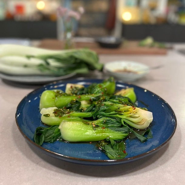 Stap 6: Leg de paksoi op een schaal en lepel de dressing erover. Serveer dit gerecht op kamertemperatuur.