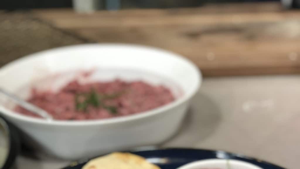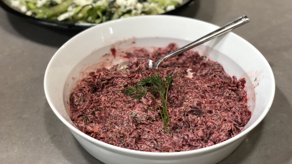 Stap 3: Meng in de kom de knoflook, dille, yoghurt en wijnazijn. Breng op smaak met zout en peper. Meng vervolgens de biet erdoor.