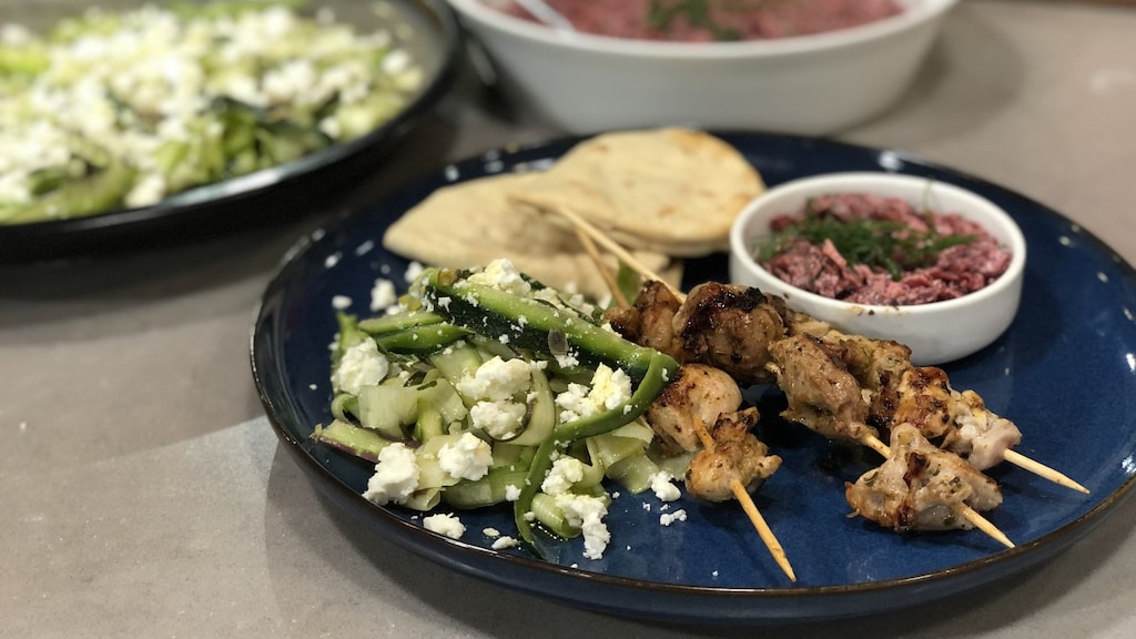 Griekse kipspiezen met bietentzatziki en courgettesalade
