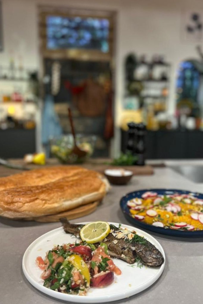 Hele forel met amandelen, Arabische kruidensalade en sinaasappelradijssalade