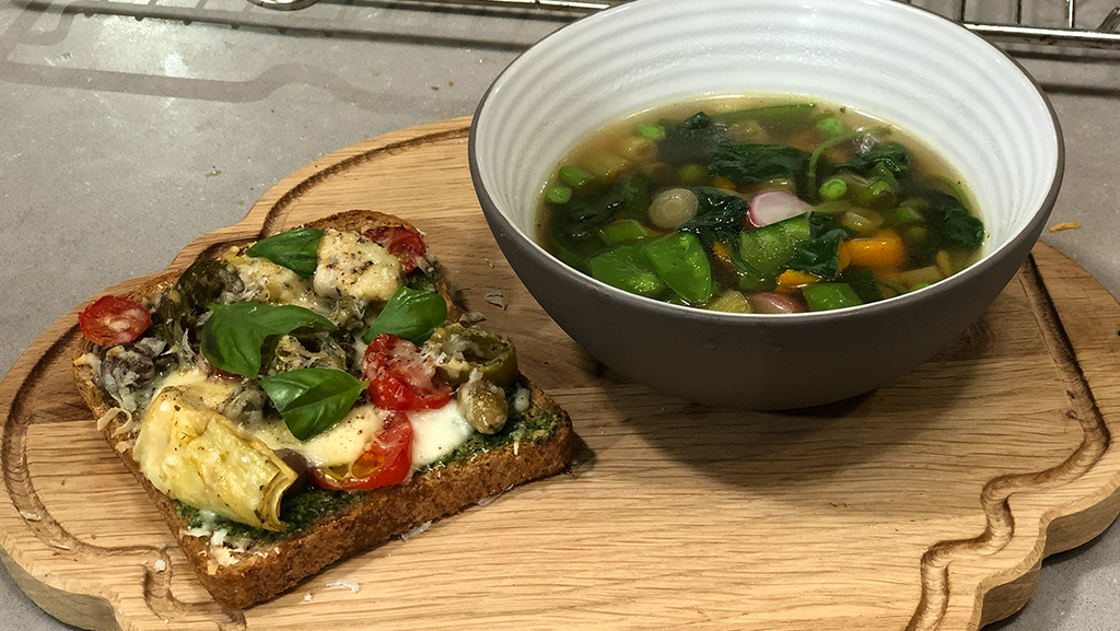 Hugo zet vandaag een snelle groentesoep met pesto op tafel. Daarbij serveert hij pizzabroodjes die hij belegt met van alles nog in de koelkast of voorraadkast staat. Dus aan de slag!