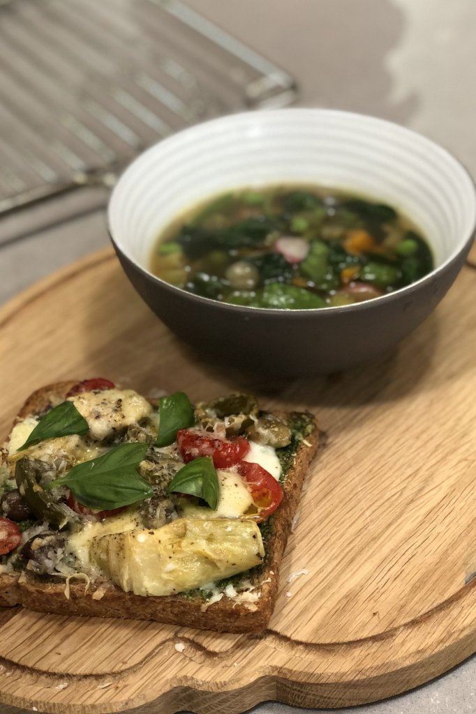 Snelle groentesoep met pesto en pizzabroodjes