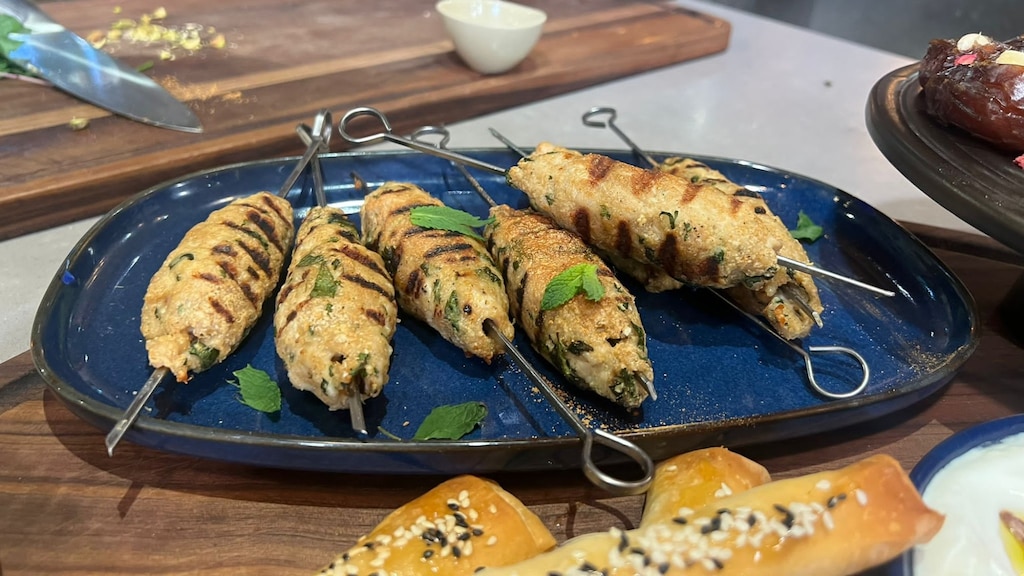 Stap 8: Rooster de kebab in de grillpan circa 5 minuten per kant. Draai niet onnodig veel aan de spiesen.