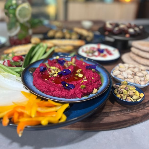 Stap 1: Snijd de biet grof en pel de knoflook. Pureer de biet, knoflook, kikkererwten, komijn en sesampasta tot een glad mengsel. Breng op smaak met citroensap, zout en peper. Nu heb je een heerlijke roze hummus.